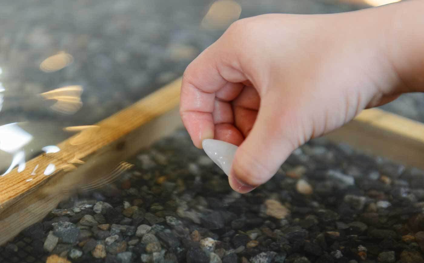 流れる水の中からスコップで宝石を探す「リバーエリア」。川底の砂利には、キラキラ光る天然石や鉱物がまざっています。運がよければ、福井でおなじみの“笏谷石”に出会えることも!?