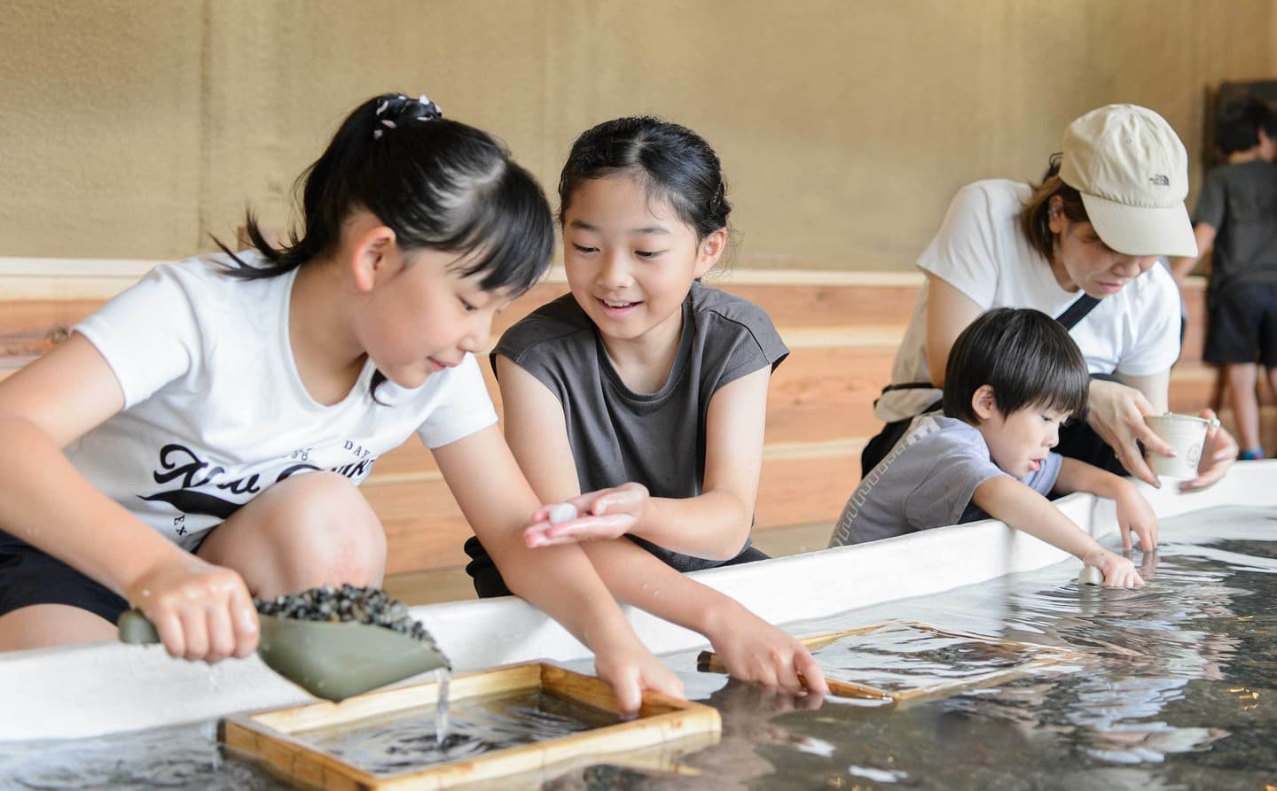 | ご案内 | ※大人まで楽しんでいただける難易度の発掘体験ですので、小学低学年までのお子様は保護者の方も一緒に体験していただくことをお勧めします。 ※小学生未満のお子様には保護者が一人安全確保のために「見守り隊」として一緒の空間に付いていただくことが可能です。お手伝いはできませんのでご了承ください。お手伝いが必要な場合は保護者の方も一緒に体験していただくことをお勧めします。 ※小学生以上のお子様と来られた発掘しない保護者の方はエリアの端で見学いただけますが、混み合う時は発掘する方を優先してご遠慮いただくことがあります。 ※2歳未満は同伴OKです(石の持ち帰りはできません)。受付時にお申し付けください。ご家庭での安全確保をお願いします。 ※小さなお子様は濡れることがあるため、タオルや着替えがあると安心です。 |