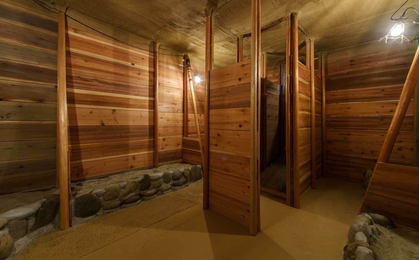 室内の流れる川で発掘体験