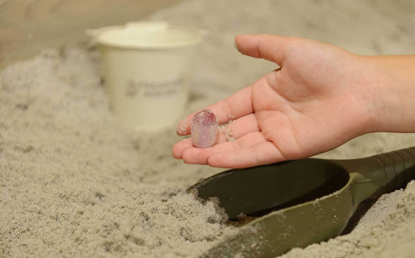 スコップや手を使って、砂の中に埋まった宝石の原石を発掘します。小さなお子さま(3歳頃~)でも楽しめる設計で、“はじめての発掘体験”にぴったりです。
